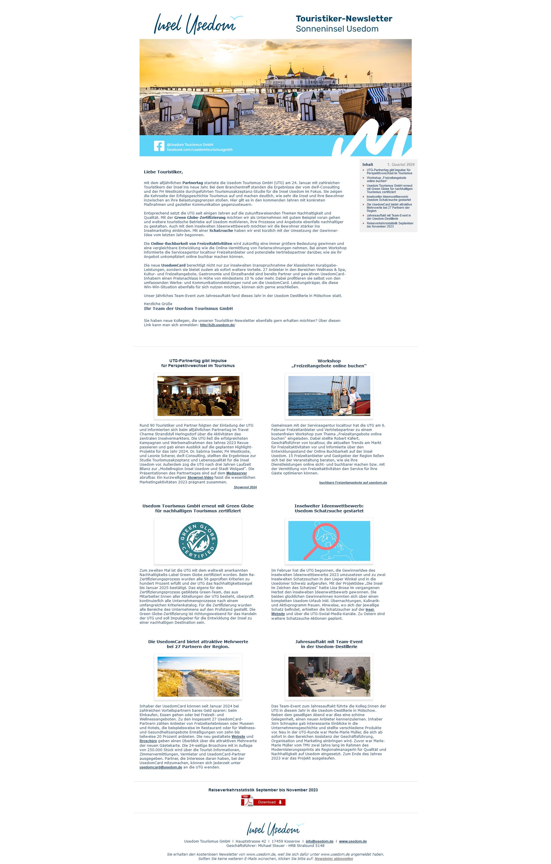 Die Usedom Tourismus GmbH (UTG) informiert touristische Partner wie Reiseleiter, Hotels und Vermieter von Ferienwohnungen sowie sämtliche Anbieter touristischer Leistungen im Touristiker-Newsletter über die Entwicklungen und Trends in der Urlaubsdestination “Insel Usedom”.